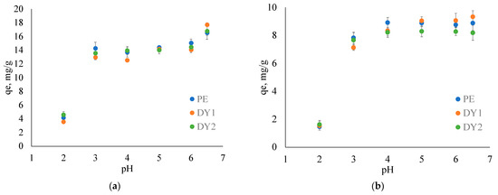 Effect of pH on equilibrium adsorption capacity of (a) Cu2+ and (b) Ni2+ ions on PE, DY1 and DY2 HAs (t = 25 °C).