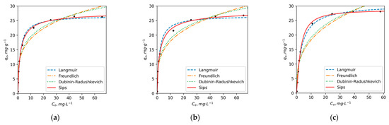 The adsorption isotherms were constructed by fitting the experimental data to non-linear Langmuir [50], Freundlich [51], Dubinin–Radushkevich (D-R) (equation adapted for adsorption from aqueous solution) [52] and Sips [53] adsorption models for both Cu2+ and Ni2+. To fit these models and to calculate the parameters of the adsorption, the corresponding Equations (6)–(9) were used: