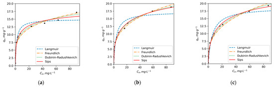 where qe is the equilibrium and qm is the maximum adsorption capacity of metal ions (mg/g); Ce is the equilibrium concentration of metal ions (mg/L); KL is the Langmuir constant (L/g); KF is the Freundlich constant (L/g); n is the indicator of the surface heterogeneity degree; β is activity coefficient which represents the adsorption energy (mol2·kJ−2), from which mean free energy was calculated as E = (kJ/mol); Cs is the solubility (mg/L); R is the molar gas constant (J/(mol⋅K)); T is the temperature (K); KS is the Sips constant related to the energy of adsorption (L/g); and n is the Sips model exponent, which describes the heterogeneity of the adsorption sites on the sorbent surface.