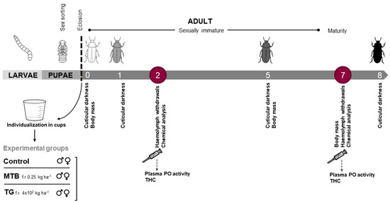 The exposure of beetles to herbicide and fertilizer was established in a completely randomized design for males and females by adding 150 µL of the recommended field dose solutions (see Section 2.2) administered on filter paper in the respective groups (MTB: 2.25 × 10−2 mg in distilled water per cup; TG: 36 mg in distilled water per cup; calculated proportionally on a filter paper surface of 9 cm2), while it was soaked with the vehicle only (150 µL of distilled water) in the control group (C). The wet filter paper was the only source of moisture for the insects and was kept moist by adding 150 μm of sterile phosphate-buffered saline (PBS, 10 mM; Sigma-Aldrich, Milan, Italy) to all groups on alternate days. The first set of beetles exposed to MTB (20 males and 20 females), TG (20 males and 20 females), and the control group (C, 40 males and 40 females) was used to evaluate the accumulation of the trace element according to the chemical analysis protocol below. The second experimental group was formed to measure the relationship among treatment exposure, sex, and age in terms of immunological and physiological (body mass, cuticle darkness) markers. Beetles were exposed to each treatment with MTB and TG for a total of 8 days (Figure 1). The duration of the exposure was chosen to follow the progression through the sexual maturation interval. To ensure repeatability, each experiment was performed in duplicate, and beetles were exposed individually as single biological replicates.