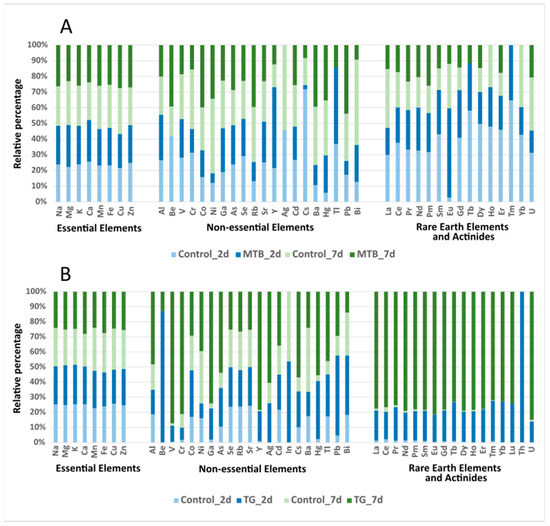 Relative abundance of elements in T. molitor adults. The relative percentages of each element refer to the respective experimental groups of beetles exposed to metribuzin-based herbicide (MTB, A) and NPK-based fertilizer (TG, B), and the control group, at 2 (2 d) and 7 (7 d) days of treatment.