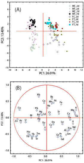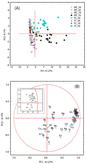 The datasets of element concentrations in beetles were explored by a principal component analysis (PCA) to detect the presence of patterns among samples from exposure tests in an unsupervised mode. The MTB-treated samples and corresponding control ones showed a clustering on PC1 according to their sex (Figure 3A,B) (i.e., males and females had negative and positive scores on the first principal component PC1, respectively). The elements with the most positive loadings (>0.7) on PC1 were, in decreasing order, K, Ga, Mg, Nd, V, and Se; they predominantly characterized the female specimens. On the other hand, As, Cu, and Zn were the elements with markedly negative loading values (<−0.7) on PC1 that characterized males (Figure 3A,B). The metals leading PC2 can be influenced by the exposure time. Indeed, no separate patterns over time were found in the treated and control groups, for both males and females. On the contrary, separation by age was observed in males, evident as a clustering of specimens between 2-day (young)- and 7-day (sexually mature)-exposed beetles (Figure 3), unrelated to treatment.