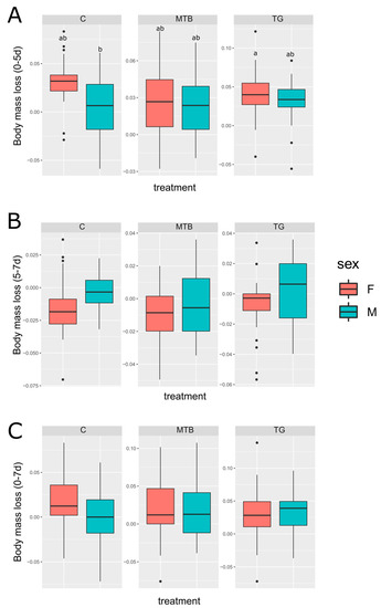 Relative loss of body mass in T. molitor exposed to metribuzin-based herbicide (MTB; N = 30) and NPK fertilizer (TG; N = 30) and in the control group (C; N = 30). Panels show relative body mass loss in males (M) and females (F) between 0 and 7 (A), 0 and 5 (B), and 5 and 7 (C) days after eclosion. Boxplots not sharing the same letter are significantly different at p-value < 0.05. Where letters are not shown, no significant differences were found.