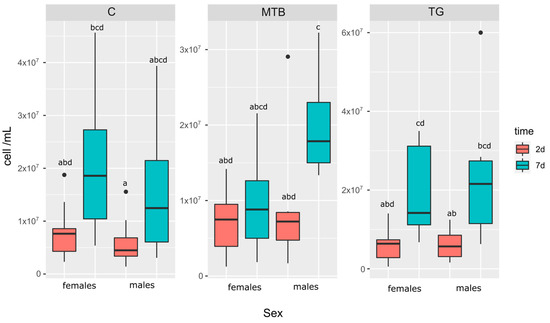 Hemocyte density was found to be dependent on the age of the beetle (Figure 6). Indeed, an increase in circulating hemocytes was recorded 7 days after eclosion (males: (15.14 ± 3.74) × 106 cells mL−1; females: (20.63 ± 4.71) × 106 cells mL−1) compared to THC in 2-day-old beetles (males: (5.71 ± 1.13) × 106 cells mL−1; females: (7.77 ± 1.35) × 106 cells mL−1) in the control group. Although 7-day-old females and males showed an approximately threefold increase in THC over time, the change was not statistically significant (p > 0.05), indicating a greater individual availability of circulating cells in the hemocoel in both males and females after 7 days. The same trend was observed in beetles from the TG-treated group. Although circulating hemocytes increased in 7-day-old specimens (males: (19.86 ± 3.52) × 106 cells mL−1; females: (22.22 ± 4.56) × 106 cells mL−1), there was no statistically significant difference with the corresponding younger groups (2-day-old p > 0. 05; males: (5.57 ± 1.10) × 106 cells mL−1; females: (6.00 ± 1.15) × 106 cells mL−1), although a trend (p = 0.06) was reported comparing TG-treated females at 2 days with those at 7 days. In addition, TG-treated males showed a significant change at 7 days after eclosion compared with young (2 days) males from the control group (p < 0.05), indicating a greater increase over time in males from the TG-treated group. In the male group exposed to MTB, the increase in THC was greater after 7 days ((20.10 ± 1.96) × 106 cells mL−1), showing a statistically significant change (p < 0.05) compared with the 2-day-old beetles (Figure 6, MTB; (8.17 ± 2.21) × 106 cells mL−1). The cell density of MTB-treated males at 7 days was also significantly higher (p < 0.05) than the values found in all groups of young males and females of the control and the TG- and MTB-treated groups. The MTB-treated females did not follow the same behavior as the other groups; rather, the circulating cells remained stable over time (p = 1; 2d: (7.29 ± 1.29) × 106 cells mL−1; 7d: (9.76 ± 2.35) × 106 cells mL−1), showing the lowest density of circulating hemocytes after 7 days. No significant gender differences in THC were found in any of the groups tested (p > 0.05).