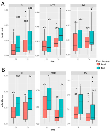 In the MTB- and TG-treated groups, no significant differences (p > 0.05) were found when comparing basal and total PO enzyme activity with control group values in both males and females. However, although not statistically significant (p > 0.05), the treatments reduced the plasmatic total PO enzymatic activity levels in both MTB- and TG-treated males compared to the young beetles in each group after 2 days. Furthermore, MTB- and TG-treated groups showed an inverse response to the 7-day control group, where the stability of total PO enzymatic activity was observed over time. A significant difference (p < 0.05) was observed between total and basal PO enzymatic activity in TG-treated males 2 days after eclosion, but not in MTB-treated males, although basal PO enzymatic activity was lower than total PO enzymatic activity. The same trend is not evident in females, as they showed lower levels of total PO enzyme activity comparable to basal PO activity.