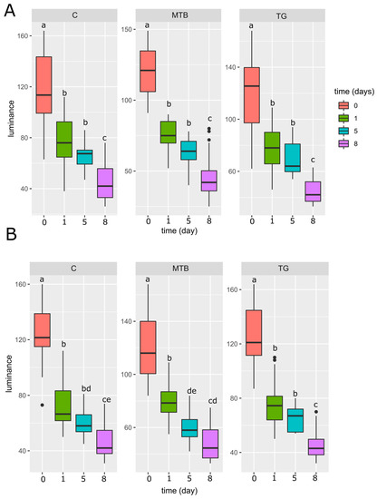 Cuticular darkness of elytra, expressed as luminance degree, in adult T. molitor exposed to the metribuzin-based herbicide (MTB; N = 30) and NPK fertilizer (TG; N = 30) and in the control group (C; N = 30). Cuticular darkness is shown in females (A) and males (B) at 0, 1, 5, and 8 days after eclosion. Boxplots not sharing the same letter are significantly different at p-value < 0.05.