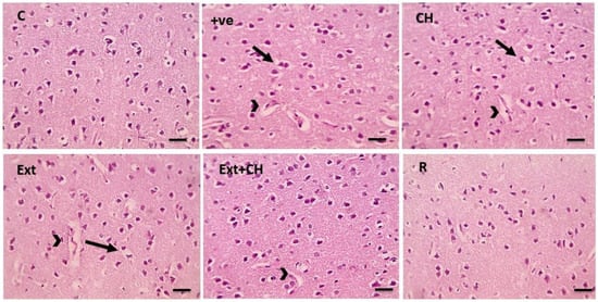 Microscopic pictures of HE-stained cerebral cortical sections x400 showing normal neurons in the control group (C). Cerebral cortical cells from the +ve group showed marked perineuronal (black arrows) and perivascular (arrowheads) edema. Cerebral cortical sections from the choline (CH) group showed moderate perineuronal (black arrows) and perivascular (arrowheads) edema. Cerebral cortical sections from fruit extract (EXT)group mild perineuronal (black arrows) and perivascular (arrowheads) edema. Cerebral cortical sections from the Fruit extract + choline (Ext + CH) group had milder perivascular edema (arrowheads). Cerebral cortical sections from Rivastgmine (R) group show an improved histological picture.