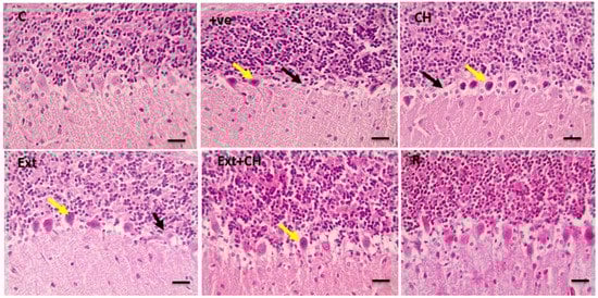 Microscopic pictures of HE-stained cerebellar sections x400 showing standard Purkinje layer in the control group (C). Cerebellar sections from the +ve group showed a significant loss of Purkinje fibers (black arrows) with degenerated neurons (yellow arrows). Cerebellar sections from the choline (CH) group showed marked focal loss of Purkinje fibers (black arrows) with many degenerated neurons (yellow arrows). Cerebellar sections from the fruit extract (EXT)group show considerable focal loss of Purkinje fibers (black arrows) with some degenerated Purkinje neurons (yellow arrows). Cerebellar sections from fruit extract + choline (Ext + CH) showing few degenerated Purkinje neurons (yellow arrows). Cerebellar sections from the rivastigmine (R) group show normal Purkinje neurons.