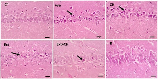 Microscopic pictures of HE-stained hippocampal sections x400 showing normal neurons of the pyramidal layer in the control group (C). Cerebral cortical sections from the (+ve) group show many shrunken and degenerated neurons (black arrows). Cerebral cortical sections from choline (CH) show many shrunken and degenerated neurons (black arrows). Cerebral cortical sections from the fruit extract (EXT)group showed few shrunken and degenerated neurons (black arrows). Cerebral cortical sections from the Fruit extract + choline (Ext + CH) group have few shrunken and degenerated neurons. Cerebral cortical sections from the rivastgmine (R) group show an improved histological picture.