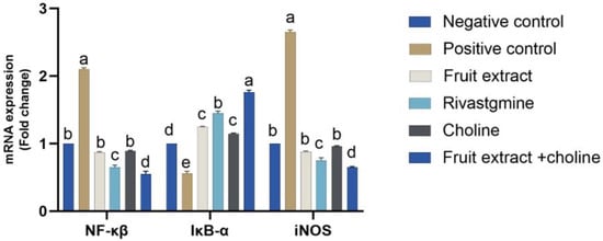 Effects of Jambolan extract and/or choline on the mRNA transcription of inflammatory-related signaling pathways (iNOS, NF-κβ, and IκB-α). Data were presented as mean ± SD. Different superscripts a–d indicated significant differences within the column. A significant p-value < 0.05.