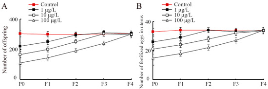 The exposure routes of nanoplastics for environmental animals and humans may mainly contain oral, dermal, and inhalation routes [11,12]. More importantly, once bioavailable, nanoplastics can further cross primary biological barriers to reach other tissues and system circulation [13,14]. After ingestion, the excretory system of environmental animals may expel more than 90% of nanoplastics in feces [15], which implies that the excretory system is the main targeted organ at the parental generation (P0-G). Nanoplastic exposure induces toxicity on environmental animals (such as zebrafish and Daphnia) and human health [16,17,18]. Several factors have been suggested to likely affect the toxicity induction of nanoplastics, including size, charge, dose, and leachables [19]. Moreover, the other adsorbed pollutants may also imply the interaction between nanoplastics and pollutants, such as the enhancement in contaminant transport [20,21]. Recently, the transgenerational or multigenerational toxicities of nanoplastics were further detected in Daphnia and mice [22,23,24].