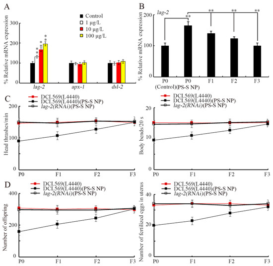 To further investigate the role of lag-2 in transgenerational PS-S NP toxicity, germline RNAi of lag-2 was performed using strain DCL569 [63]. The RNAi of lag-2 using the bacterial feeding method significantly reversed the alterations in body bend, head thrash, brood size, and fertilized egg number in the uterus in 10 μg/L PS-S NP exposed parents, as well as in their offspring (Figure 3C,D). Namely, germline RNAi of lag-2 showed the resistance to transgenerational toxicity.