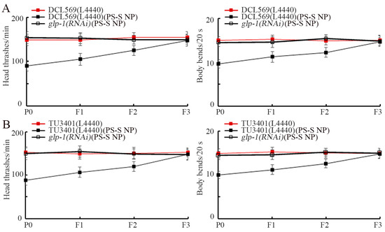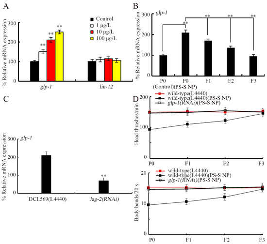 We further carried out RNAi of glp-1 to investigate its possible function in controlling transgenerational PS-S NP toxicity. Considering glp-1 mutant nematodes have germline-loss phenotype [64,65], we employed locomotion as the endpoint. The transgenerational inhibition in locomotion observed in 10 μg/L PS-S NP-exposed animals was prevented by RNAi of glp-1 (Figure 4D). Therefore, both Notch ligand/LAG-2 and Notch receptor/GLP-1 were essential for the formation of transgenerational PS-S NP toxicity.