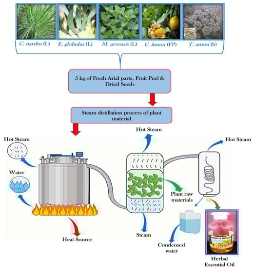 Fresh leaves from Cymbopogon nardus (L.) Rendle (Poaceae), Eucalyptus globulus Labill, 1800 (Myrtaceae), Mentha arvensis L. (Lamiaceae), fruit peel from Citrus limon L. (Rutaceae), and dried seeds from Trachyspermum ammi L. (Apiaceae) were acquired between July and September-2022 from the Jawadhu Hills in the Tiruvannamalai District of Tamilnadu, India. Dr. C. Hema, Head of the Department of Botany, validated the taxonomic identity of these plants. The freshly collected plant material was frozen at −20 °C before being used for the extraction of herbal EOs.