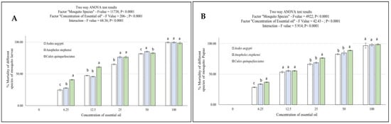 Mortality index of Ae. aegypti, An. Stephensi, and Cx. quinquefasciatus 4th instar larvae and pupa [(A) larvae and (B) Pupa] exposed to the essential oil formulation. Bars indicate the mean ± SD. The data were subjected to a two-way ANOVA with a 5% chance of success for the Tukey post-test. At the top of the charts are statistical summaries. Differences between groups exposed to each type of exposure concentration are indicated by distinct lowercase letters. The concentrations to which Ae. aegypti, An. stephensi, and Cx. quinquefasciatus larvae and pupa were exposed (each test was repeated at n = 5), corresponding to the concentrations at which small letters show significant differences between groups treated with essential oil at 6.25, 12.5, 25, 50, and 100 ppm.