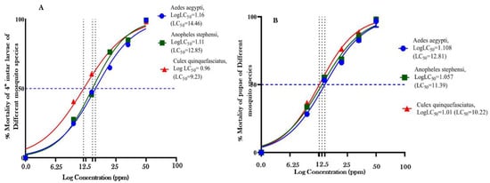 Ae. aegypti, An. stephensi, and Cx. quinquefasciatus 4th instar larvae and pupa [(A) Larvae and (B) Pupa] in response to varying concentrations of EOF, and a mortality curve was generated using the concentration–response (Probit) model.