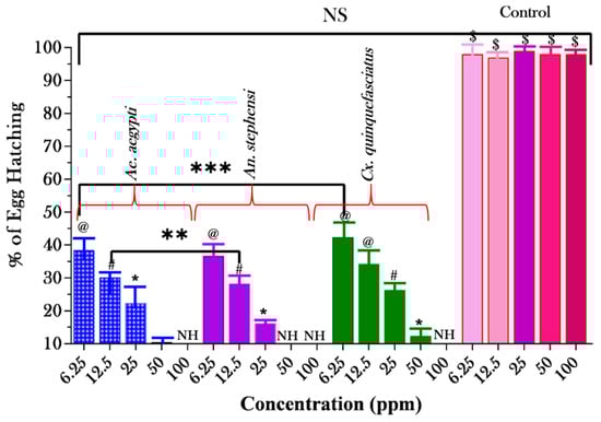 Different concentrations of an essential oil formulation (EOF) have been shown to have mosquito ovicidal activity against the eggs of Ae. aegypti, An. stephensi, and Cx. quinquefasciatus. (*, @, # and $) Different letters on the bars showed significant differences when the egg hatching was compared between different test concentrations after a particular time period separately (p < 0.05). Using only tap water as the control, 100% of the eggs hatched. Repeating the experiment with n = 5 and NH (no hatchability), resulted in 100% mortality (**, *** Significant in each tested groups; NS: non-significant in tested and control groups).