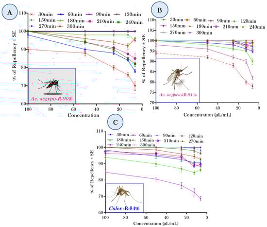 The effectiveness of varying concentrations of EOF and DEET in terms of repellence against (A) Ae. aegypti, (B) An. stephensi, and (C) Cx. quinquefasciatus mosquitoes. Time protection and test concentration varied considerably (p < 0.05). The standard deviation is shown by the error bars on each line.