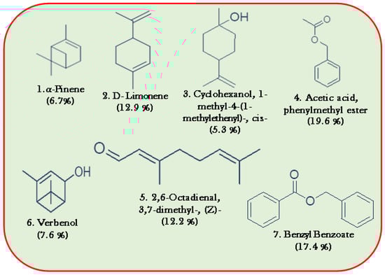 A total of 34 distinct compounds were found in the five formulations of the most bioactive EOs, as evaluated via GC-MS (Table 4). EOFs rich in α-pinene (6.7%), D-limonene (12.9%), cyclohexane, 1-methyl-4-(1-methylethenyl)-, cis-(5.3%), acetic acid, phenylmethyl ester (19.6%), 2,6-octadienal, 3,7-dimethyl-, (Z)-(12.2%), verbenol (7.6%), benzyl benzoate (17.4%) are presented in Figure 6. The minimum level, such as γ-terpinene (1.6%), 2-pentanone, 4-(2,6,6-trimethyl-2-cyclohexenyl) (2.3%), geranyl acetate (1.1%), 1h-benzocycloheptene, 2,4a,5,6,7,8,9,9a-octahydro-3,5,5-trimethyl-9-methylene (1.0%), isoaromadendrene epoxide (1.0%), and di-epi-α-cedrene-(I) (2.7%) were present in the EOFs. Finally, d-limonene, as well as 2,6-octadienal, 3,7-dimethyl-, (Z)-, including benzyl benzoate, were the main constituent of the EOFs, and all of the compounds constituted 99.998% of the combined list of EOF compounds tabulated in Table 4.