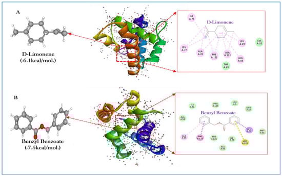 Two-dimensional and three-dimensional intermolecular contact between EOF compounds (A) D-limonene and (B) Benzyl benzoate against mosquito odorant-binding protein 4 (PDB: 3Q8I).