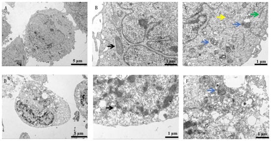 TEM images of BEAS-2B cells in the control group. (A) The cell membrane and the nuclear membrane are intact. (B) Mitochondria are clear and intact (black arrows) with clear ridges. (C) The lysosomes (blue arrows), Golgi apparatus (yellow arrows), and endoplasmic reticulum (green arrows) are clear and intact. Sonicated WC solution was added to BEAS-2B cells and incubated for 24 h. TEM images of BEAS-2B cells exposed to nano-WC. (D) The cytosol and nucleus with a nuclear membrane are largely intact. The nucleoplasm is condensed around the nuclear membrane, and there are numerous intracellular vacuoles. (E) Mitochondria (black arrows) are poorly defined. (F) There are numerous intracellular vacuoles and the lysosomes (blue arrows) are poorly defined.