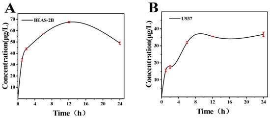 Temporal dissolution curves of nano-WC in BEAS-2B and U937 cells. (A) W6+ concentration in the supernatants of BEAS-2B treated with 200 μg/mL nano-WC for 0, 1, 2, 6, 12, and 24 h. (B) W6+ concentration in the supernatants of U937 treated with 200 μg/mL nano-WC for 0, 1, 2, 6, 12, and 24 h.
