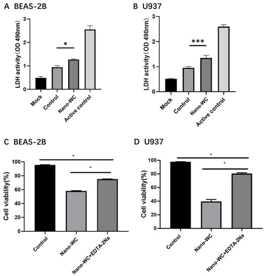 LDH activity of BEAS-2B cells (A) and U937 cells (B) treated with the condition medium of nano-WC-treated cells. LDH activity of BEAS-2B cells (C) and U937 cells (D) treated with the condition medium with or without EDTA-2Na. The data on the figures represent mean ± SD. * p < 0.05 and *** p < 0.001 vs. control group.