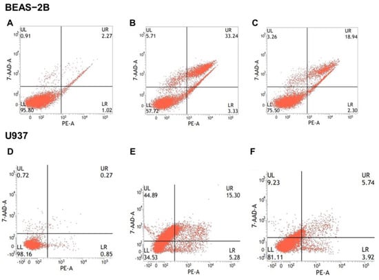 Flow cytometry measurements of BEAS-2B cells and U937 cells in the control (A,D), nano-WC (B,E), and nano-WC + EDTA-2Na (C,F) groups. Apoptosis rates were calculated based on Figure 5.