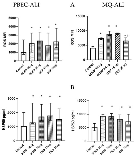 Figure 1. BDEP/DEP (µg/cm2 labeled as µg in the figure) induced oxidative stress. (A) PBEC-ALI and MQ-ALI were exposed to BDEP or DEP for 2 h. Both BDEP and DEP induced ROS generation in PBEC-ALI (N = 3, n = 6) and MQ-ALI (N = 3, n = 6). (B). Both PBEC-ALI and MQ-ALI were exposed to BDEP/DEP for 6 h. Cell lysates were used to measure the intracellular HSP60 level. Both BDEP and DEP induced HSP60 in PBEC-ALI (N = 3, n = 6) and MQ-ALI (N = 3, n = 6). Difference with a p value ≤ 0.05 was considered statistically significant compared to control and was indicated by * and statistical significance between DEP 18 µg and DEP 36 µg was indicated by #.