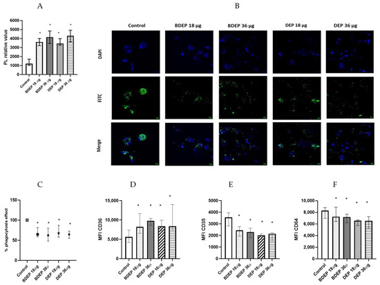 Figure 3. Lipid level and phagocytosis activity. (A) Intracellular phospholipid was measured from MQ-ALI. MQ-ALI. BDEP and DEP (µg/cm2 labeled as µg in the figure) exposed MQ-ALI models showed increased intracellular levels of phospholipids, N = 3, n = 6. (B) Microscopic analysis of phagocytosis assay identified reduced phagocytosis of E. coli particles (FITC labeled) in BDEP/DEP-exposed MQ. The microscopic images were taken at 40x magnification. Uptake of E. coli particles was lower in BDEP/DEP-exposed MQ in compared to control MQ, one representative of three individual observation, scale bar 10 µm (C) quantitative analysis of phagocytosis assay identified reduced phagocytosis of E. coli particles (FITC labeled) by both BDEP and DEP-exposed MQ, (N = 3, n = 6). (DF): CD36 (D) surface expression was upregulated while CD35 (E) and CD64 (F) surface expression was reduced in BDEP and DEP-exposed MQ-ALI, N = 3, n = 6. Difference with a p value < 0.05 was considered statistically significance compared to control and was indicated by *.