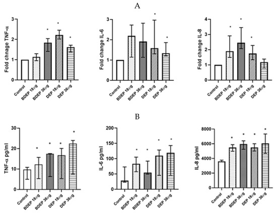 Figure 4. (A) Gene expression of pro-inflammatory cytokines TNF-α, IL-6, and chemokine CXCL8 were upregulated in response to either concentration of BDEP and DEP (µg/cm2 labeled as µg in the figure) at 18 µg/cm2 in PBEC-ALI, (N = 3, n = 6). (B) Similarly, secretion of these cytokines and chemokines at protein levels were induced in PBEC-ALI by both BDEP and DEP, (N = 3, n = 6). Statistical significance (p < 0.05) in comparison to control (sham) to all treatment condition was expressed with *.