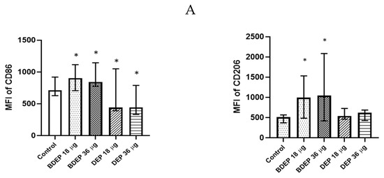 Figure 2. BDEP/DEP (µg/cm2 labeled as µg in the figure) induced expression of both M1 and M2 macrophages polarization markers. MQ-ALI was exposed to BDEP/PDEP for 18 h. Both BDEP and DEP induced an increased expression of M1 specific surface marker CD86 (left) and M2 specific surface marker CD206 (right), N = 3, n = 6. A difference with a p value < 0.05 was considered statistically compared to control and was indicated by *.