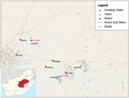 The Mangaung Metropolitan Municipality is classified as a category-A municipality. It is centrally positioned in South Africa’s Free State Province (Figure 1). It is located at 29°10′00″ S and 26°1′67″ E, at an area that covers approximately 9899 km2. It is home to 878,834 people, which accounts for roughly 28% of the provincial population. The temperatures may vary from 1.3 °C to 21 °C during winter and from 13 °C to 30.9 °C during summer. The municipality’s average annual rainfall is approximately 476 mm, with February being the wettest month. The Mangaung Metropolitan Municipality has only one biome, grassland, which covers the entire municipality. In the Mangaung Metro, commercial agriculture accounts for 22.96% of land, with pivot irrigation accounting for 1.4% and cultivated orchards accounting for 0.02%. Agriculture is a major economic activity in the Mangaung Metro, with commercial, small-scale, and subsistence farming all practiced. An estimated 46,172 households, or 19.4% of the total households in the municipality, rely on agricultural activities for a living. Crop farming accounts for 67.5% of agricultural activities in the Mangaung Metro, followed by livestock farming, mixed farming, and finally other types of agriculture. Community services, finance, trade, transportation, and manufacturing are some of the other economic sectors in the municipality. As both the Water Services Authority and the Water Service Provider, the Mangaung Metropolitan Municipality is obligated to fulfil its mandate of providing safe and dependable portable water to its consumers. The Mangaung Metro’s water resources include dams (reservoirs), rivers, wetlands, and groundwater resources. The city’s bulk water supply is currently 31% supplied by its water treatment works and 69% supplied by other providers [].