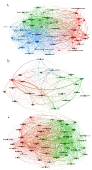 Research focal points and trends of microplastics in freshwater ecosystems over different periods. (a): 2013–2022; (b): 2013–2017; (c): 2018–2022. The size of the circles indicates the frequency of the keywords; the larger the circle, the higher the frequency of occurrence; the different colors symbolize the hot topics in which the keywords are found, with the keywords at the edges of the hot topics being transitional words; and the lines between the keywords indicate their connections to other keywords.