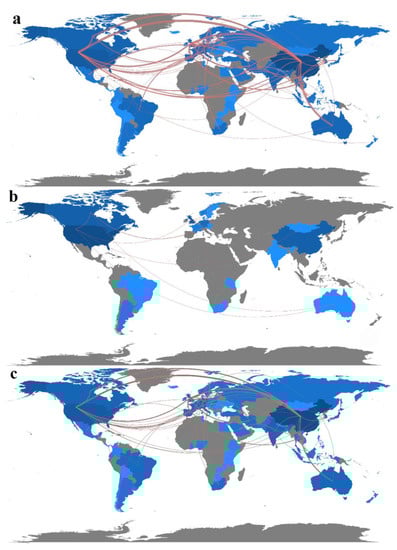 Temporal trend changes in international cooperation on microplastics in aquatic ecosystems. (a): 2013–2022; (b): 2013–2017; (c): 2018–2022. The shade of color indicates the number of articles published by countries; the darker the color, the more articles are published; red lines indicate international collaborations; the higher the volume of collaborative publications between two countries, the thicker the red line between them and the closer the relationship (We specify that the display starts after more than five international collaborations in 2013–2017 and after more than ten international collaborations in 2017–2022).