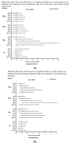 Multivariate odds ratios (with 95%CIs) for in-hospital mortality per IQR increase in PM2.5, PM10, and NO2 during the (a) warm season and (b) cold season. Adjustments were made for current smoker, dyslipidemia, Killip III–IV, temperature, and humidity. * p < 0.05.