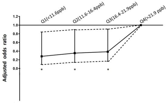 The exposure–response relationship between NO2 levels and the risk of STEMI was calculated to explore the potential threshold. Figure 4 shows that decreased levels of NO2 were significantly associated with a decreased risk of in-hospital mortality compared to higher levels of NO2 (Q4, >21.9 ppb). Compared to Q4 level NO2, exposure to Q1 level (NO2 < 11.6 ppb), Q2 level (NO2 16.4–16.4 ppb), and Q3 level (NO2 16.421.9 ppb) were significantly associated with a decreased risk for in-hospital mortality, and the ORs (95%CIs) were 0.280 (0.093–0.842, p = 0.023), 0.355 (0.140–0.898, p = 0.029), and 0.386 (0.164–0.906, p = 0.029), respectively.