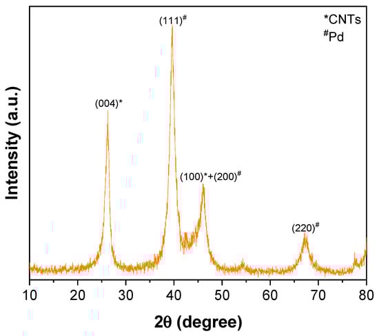 The ATR–FTIR spectrum of CNTs–COOH (Figure 1a) exhibited the bands at 612 and 1634 cm−1 corresponding to the A2u and E1u phonon modes of CNTs []. It showed the band due to the O–H bonds at 3360 cm−1 and the band of C=O bonds of –COOH groups existing over the surface of CNTs at 1698 cm−1 []. The band of the C=C was found at 1559 cm−1 []. Compared to the spectra of CNTs–COOH and PLA (Figure 1b), CNTs–PLA (Figure 1c) displayed important characteristic bands. In particular, the bands that appeared at 734 and 864 cm−1 were due to C=O stretching, and the band at 1040 cm−1 was due to C–CH3 stretching [,]. The significant intensity band that appeared at 1080 cm−1 was due to C–O–C vibrations, and the absorption at 1126 cm−1 was owing to CH3 vibrations []. The band of C–C–O with high frequency was established at 1179 cm−1, and the band at 1262 cm−1 corresponds to C–H and C–O–C [,]. The doublet exists at 1355 and 1379 cm−1, and the singlet at 1449 cm−1 was assigned to CH3 vibrations. The band for C=O stretching was positioned at 1744 cm−1 with high intensity. The CH and CH3 vibrations band was displayed as a doublet at 2935 and 2988 cm−1, respectively. The absorption of –OH stretching was situated at 3500 cm−1. The spectrum of CNTs–PLA–Pd (Figure 1d) revealed the distinctive bands found in the spectrum of CNTs–PLA with diminished intensity and minute shifting in their position. The powder XRD of CNTs–PLA–Pd, presented in Figure 2, demonstrated the well–resolved reflection peaks at 26.4, 39.5, 45.8, 46.1, and 67.2°. The peaks located at 26.4 and 45.8° were assigned to (0 0 2) and (1 0 0) planes of CNTs, respectively []. The peaks situated at 39.5, 46.1, and 67.2° were due to the (1 1 1), (2 0 0), and (2 2 0) planes of Pd (JCPDS No. 89–4897). The FESEM images of CNTs–PLA–Pd, illustrated in Figure 3, show the effective exfoliation of CNTs. It was approached by the successful grafting of PLA chains to the surface of CNTs. The repulsion between the polymeric chains of PLA caused the efficient exfoliation of CNTs. The presence of individual CNT is observable in Figure 3a. However, it is perceptibly visible in Figure 3b. The CNTs have a width of about 50–75 nm and a length of several μm. Some CNTs have a distracting surface, which could be created by the harsh treatment of pristine CNTs with a mixture of concentrated sulfuric and nitric acids applied before the grafting of PLA. Furthermore, the existence of densely populated Pd nanoparticles over the surface of PLA–grafted CNTs is evident in Figure 3. Nonetheless, Pd nanoparticles have assembled and formed some clusters that led to the seeding of twinned or multiple–twinned nanoparticles, which commonly occur in palladium [,,,]. The grafting of PLA to CNTs has provided a suitable environment for depositing the Pd nanoparticles and directed their strong adherence. The resilient anchoring of Pd nanoparticles to the surface of PLA–grafted CNTs prevented them from detachment.