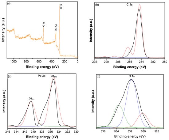 (a) XPS survey spectrum of CNTs–PLA–Pd, (b) The high–resolution spectrum of C1s, (c) The high–resolution spectrum of Pd 3d, and (d) The high–resolution spectrum of O 1 s.