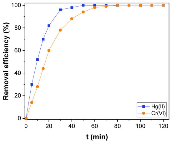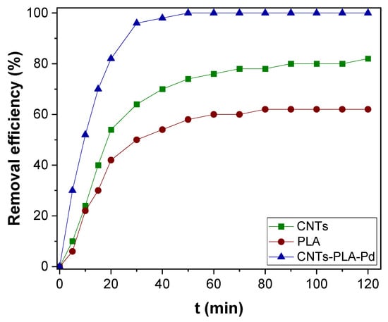 The CNTs–PLA–Pd as adsorbent, its efficiency was revealed by evaluating the adsorption rate of Hg(II), and Cr(VI) present in water. It is known that the adsorption rate depends on the contact time between the adsorbent and adsorbate. So, the adsorption rate of Hg(II) was measured as a function of contact time and compared with CNTs and PLA (Figure 5). The CNTs–PLA–Pd was able to completely adsorb the Hg(II) within 50 min. However, CNTs and PLA were able to adsorb 74 and 58% of Hg(II), respectively. Therefore, the adsorption ability of CNTs and PLA was significantly improved after their blending and deposition of Pd nanoparticles in CNTs–PLA–Pd. Also, the efficiency of CNTs–PLA–Pd was estimated by the adsorption of Cr(VI) (Figure 6). The plot perceived for qt versus t is shown in Figure S1. It represented that the adsorption rate of Hg(II) and Cr(VI) enhanced with contact time and finally red the equilibrium. Initially, the adsorption rate was high, followed by gradual reduction and final attainment of equilibrium. Within the initial 30 min, about 96 and 78% of Hg(II) and Cr(VI), respectively, were adsorbed. The complete adsorption of Hg(II) was accomplished in 50 min and Cr(VI) within 80 min. The rapid adsorption that occurred initially for 30 min could be due to the abundant availability of the active sites that exist over the surface of CNTs–PLA–Pd. With the progress of time, the active sites are being saturated by adsorption of the high quantity of Hg(II) and Cr(VI) ions and the repulsive forces transpire between solute molecules in the solid and bulk phases []. The results were analyzed by Pseudo–first and second–order models. The pseudo–first–order equation applied can be expressed as: