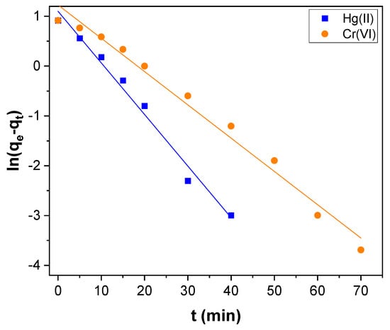 where qe and qt are the quantity of Hg(II) and Cr(VI) (mg g−1) at equilibrium and particular time t (min), respectively. k1 (min−1) is the pseudo–first–order rate constant. The slope of the plot, ln(qe − qt) versus t, provides the value of k1, and the intercept gives the theoretical value of qe.