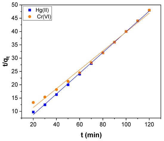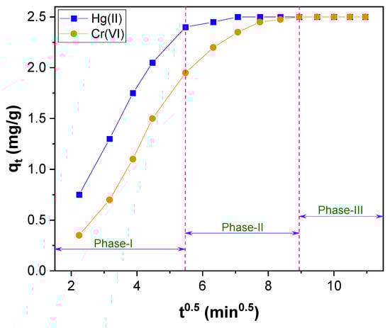 The plot of qt versus t0.5, shown in Figure 9, does not pass through the origin of the coordinates (Figure S2). So, intraparticle diffusion is not the sole rate–limiting step in the adsorption process of Hg(II) and Cr(VI). The intercept value obtained from Figure 9 was low (Table S1), and the intraparticle diffusion plot (Figure S2) revealed two straight lines. It shows that the intraparticle diffusion was not only a rate–controlling step in the Hg(II) and Cr(VI) adsorption; it was contributed by the boundary layer effect also [,]. The multilinearity of Figure 9 exhibits that the adsorption process of Hg(II) and Cr(VI) transpires through multiple phases instead of a single []. Among these multilinear steps, the initial phase occurred through the rapid adsorption of Hg(II) and Cr(VI) ions. The second phase could be the diffusion of Hg(II) and Cr(VI) ions into the pores of CNTs–PLA–Pd, and the third phase could be due to the equilibrium of adsorption that causes chemical reaction/bonding [].