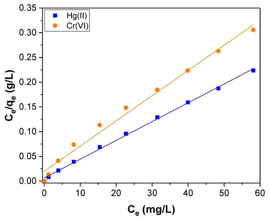 To reveal the Hg(II) and Cr(VI) adsorption in detail, the experimental equilibrium parameters were determined by three isotherm models viz., the Langmuir, the Freundlich, and the Temkin models. The Langmuir model assumes that the adsorbed molecules form a monolayer and that the adsorption can occur at a fixed number of adsorption sites and all equivalent in adsorption abilities. Each molecule also has a constant enthalpy and adsorption activation energy. In other words, all molecules have an equal affinity to entire adsorption sites []. With the help of the Langmuir isotherm model, it is possible to find the maximum adsorption capacity of the adsorbent using the linear form of the Langmuir isotherm model represented by the following equation: