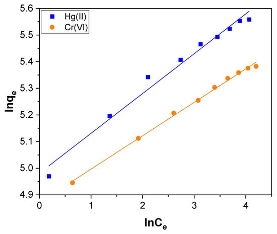 where qe (mg g−1) is the amount of Hg(II) and Cr(VI) adsorbed at equilibrium. KF and n are Freundlich constants. KF symbolizes the affinity of the adsorbent, and n signifies the adsorption intensity. Ce (mg L−1) is the concentration of Hg(II) and Cr(VI) at equilibrium. The value of KF and n were evaluated by the slope and intercept of the Freundlich isotherm plot shown in Figure 11, and the assessed values are presented in Table 2. The magnitude of the exponent, 1/n, indicates the favorability of adsorption. If the value of n ranging from 1 to 10 indicates the favorable conditions for the process of adsorption []. For the Hg(II) and Cr(VI) adsorption, the calculated value of n was 6.685 and 7.966, respectively. It reveals that Hg(II) and Cr(VI) adsorption over CNTs–PLA–Pd occurs in favorable conditions.