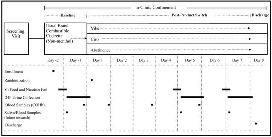 The clinical study aimed to investigate biomarker changes occurring in the blood and urine samples of smokers switched to one of three different Vuse ENDS products marketed by the R.J. Reynolds Vapor Company (Winston-Salem, NC, USA). Study findings regarding Vuse Vibe and Vuse Ciro products are presented in this manuscript, whereas the results relating to a third product (Vuse Solo) were recently published []. This two-center, randomized, controlled, switching, open-label, parallel group, clinical confinement study was conducted at two US clinical research sites (ClinicalTrials.gov identifier number; date: NCT03170674; 31 May 2017). Ethical approval was obtained from MidLands Independent Review Board, (Overland Park, KS, USA), and written informed consent was obtained from all study participants prior to study participation.