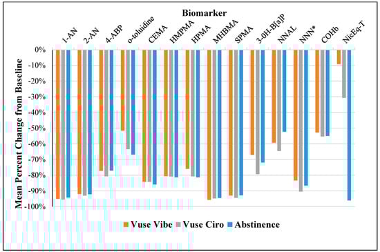 All of the non-nicotine BoE were statistically significantly decreased (p ≤ 0.001; 55–96%) from baseline among each study group, five days after switching from UB cigarettes to Vuse Vibe, Vuse Ciro, or Abstinence (Table 1). Mean percent reductions in non-nicotine BoE were generally similar among the study groups (Figure 2). Acronyms of the HPHCs and corresponding BoE are provided in the caption of Figure 2 and in Supplementary Table S3.