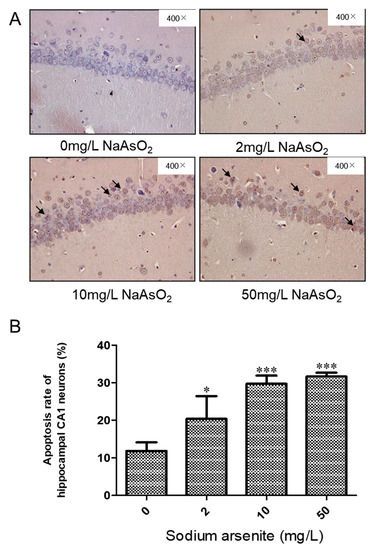 TUNEL staining was used to detect apoptosis in the hippocampi of rats exposed to different doses of arsenic. Cells with brown staining are TUNEL positive. The apoptosis rate was expressed as the percentage of TUNEL-positive cells in the total number of cells. The results showed that the apoptotic cell ratios of the hippocampus in the control group, 2, 10, and 50 mg/L NaAsO2 groups were 11.84 ± 2.27, 20.40 ± 6.01, 29.71 ± 2.18, and 31.63 ± 1.06, respectively. Compared with the control group, the apoptosis rate of the 2, 10, and 50 mg/L NaAsO2 groups was significantly increased (p < 0.05), but there was no significant difference in the apoptosis rates between the 10 mg/L and 50 mg/L NaAsO2 groups (Figure 2A,B). The above results indicated that NaAsO2 can induce apoptosis in nerve cells; in addition, the apoptotic cells induced by high doses of arsenic showed a plateau in this study.