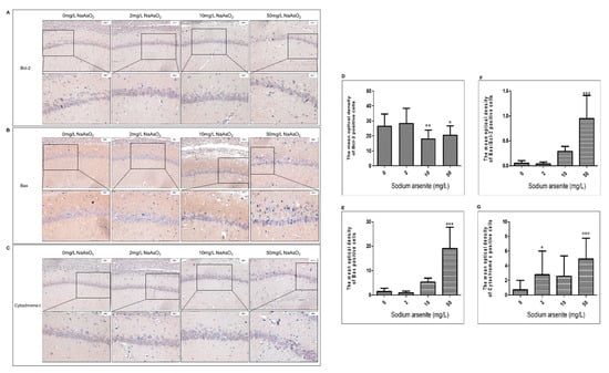 Immunohistochemistry was used to analyze the effect of arsenic on Bcl-2, Bax, and cytochrome C expression. The immunohistochemical results showed that the expression of Bcl-2, Bax, and cytochrome C was positive in the hippocampal CA1 area of rat brains, which showed brown or brownish yellow granules in the cells. Compared with the control group, the level of Bcl-2 protein in the 10 and 50 mg/L NaAsO2 groups was significantly decreased (control group vs. 10 mg/L NaAsO2 group, p < 0.01; control group vs. 50 mg/L NaAsO2 group, p < 0.05; Figure 3A,D). Compared with the control group, the level of Bax protein in the 50 mg/L NaAsO2 group was significantly increased in a dose-dependent manner (p < 0.001; Figure 3B,E), whereas the Bax/Bcl-2 ratio increased significantly in the 50 mg/L NaAsO2 group (p < 0.001; Figure 3F). Furthermore, as shown in Figure 3G, the expression level of cytochrome C in the 2 and 50 mg/L NaAsO2 groups was significantly higher than that in the control group (p < 0.05). These results indicated that NaAsO2 induced mitochondrial pathway apoptosis.