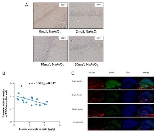 (A) and (C) Representative immunohistochemical (magnification 400×) and immunofluorescence (magnification 20×) images of PGC-1α in the hippocampal CA1 region, respectively. PGC−1α labeled in red, NeuN labeled in green, DAPI labeled in blue. (B) Representative image of correlation analysis between PGC-1α expression (the mean optical density of immunohistochemical staining) in hippocampal CA1 region and brain arsenic levels, n = 4.
