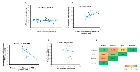 (A) Correlation analysis between ATP and arsenic contents in brain. (B) Correlation analysis between ATP content and PGC−1α immunohistochemical mean optical density. (C) Correlation analysis between apoptosis and PGC−1α immunohistochemical mean optical density. (D) Correlation analysis between apoptosis and ATP content. (E) Correlation analysis between arsenic, PGC−1α, ATP, and apoptosis in brain. * p < 0.05.
